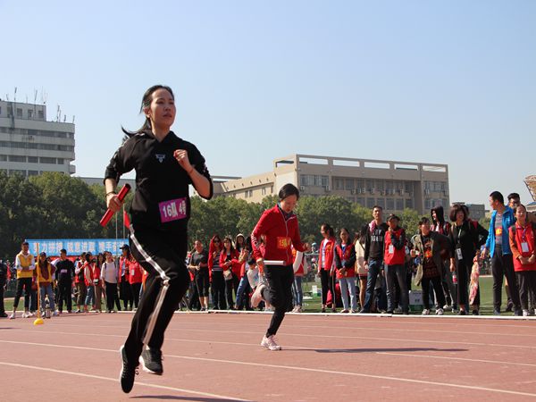 第三项比赛是“快乐传递”,教职工们站成一排手拉手,将呼啦圈由队首第一人传至最后一人,用时最短者胜出。他们的手相互紧握,照准角度,相互配合,让呼啦圈在紧张的氛围中不失秩序地传送至下一个人,将呼啦圈灵活玩转。最后一项比赛是“团结杯”接力赛,30位队员接力,往返跑100m后,将手中的接力棒传递给下一个人,用时最短的队伍获胜。一声枪响,教职工们就如同离弦的箭快速向前跑去,使尽浑身解数去冲刺,在赛场上展现了自己的飒爽英姿,诠释着运动的魅力。