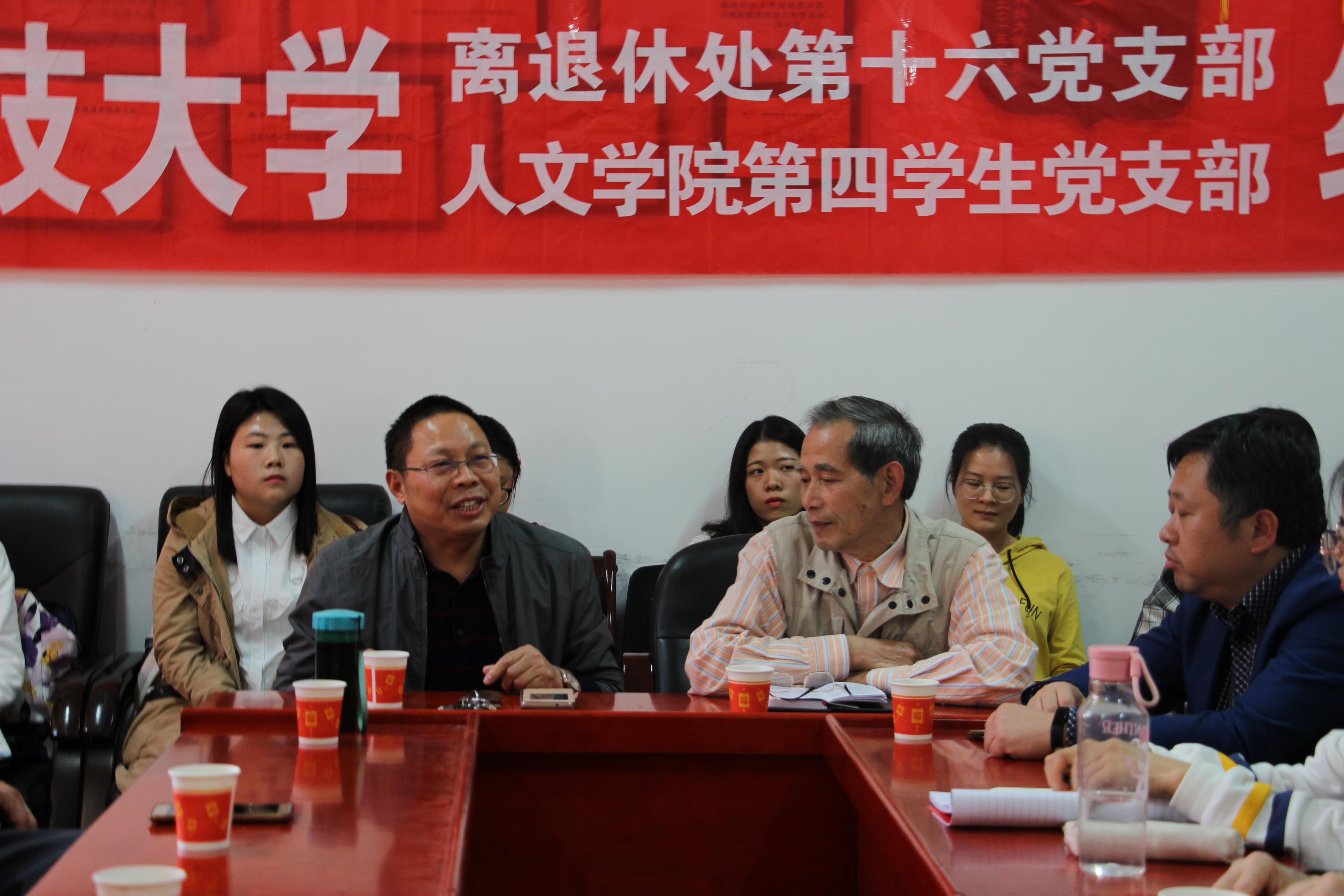 离退休处第十六党支部的其他党员也纷纷对青年党员提出了殷切的希望。离退休处第十六党支部宣传委员曾钢城告诫年轻人:在学校要把学习好搞好,将来到工作岗位上要把工作做好,年轻时不仅要“文明其精神”还要“野蛮其体魄”。有着60年党龄的86岁党员李大堂也强调了身体健康的重要性,认为身体是革命的本钱,不要太计较名利和得失,要时刻保持快乐的心情,要活到老学到老。另外他还回忆起早年加入中国共青团的经历和入党时对着党旗宣誓的情景,他认为自己是党组织培养出来的,所以就要跟党走,一心一意为人民服务。