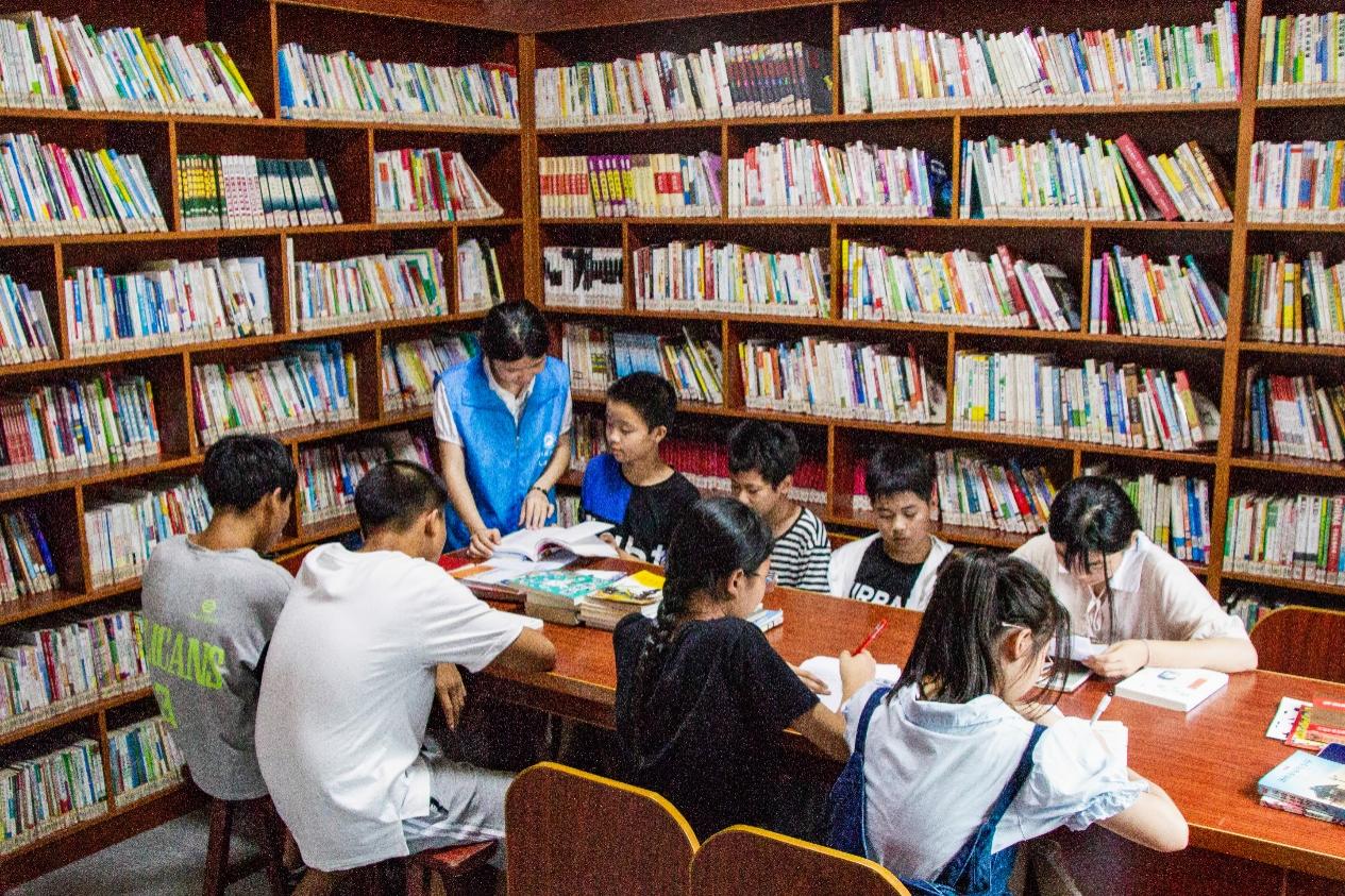 ▲志愿者在指导同学们读书