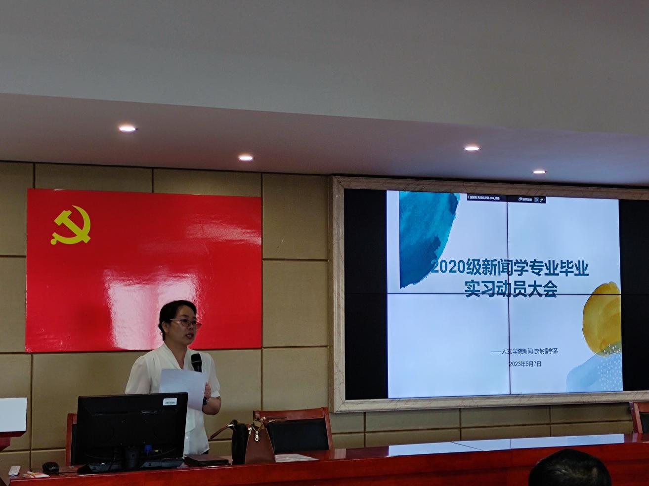 6月7日下午,我院2020级新闻学专业毕业实习动员大会于立言楼B4-1室顺利召开。本次大会由MK体育新闻系主办,MK体育副院长袁星洁,新闻系主任刘艳凤、副主任王超群、新闻系老师、20级本部及潇湘新闻专业学生参加本次会议,会议由刘艳凤主持。