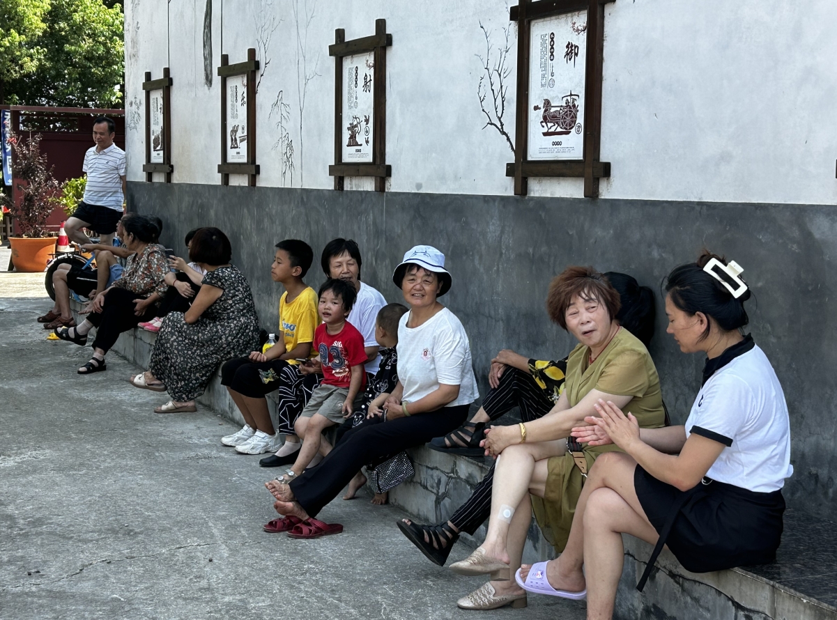 稻田吹来阵阵清风,带来了夏日清新的味道。株洲市攸县谭家垅村同心文化广场边的屋檐下,一位面容慈祥的奶奶坐在石泥堆砌的座位上,一手晃悠悠地摇着扇子,一手轻轻抚摸着坐在身边的小孙子。她名为聂祝姑,是儿童之家孩子们的家长之一。