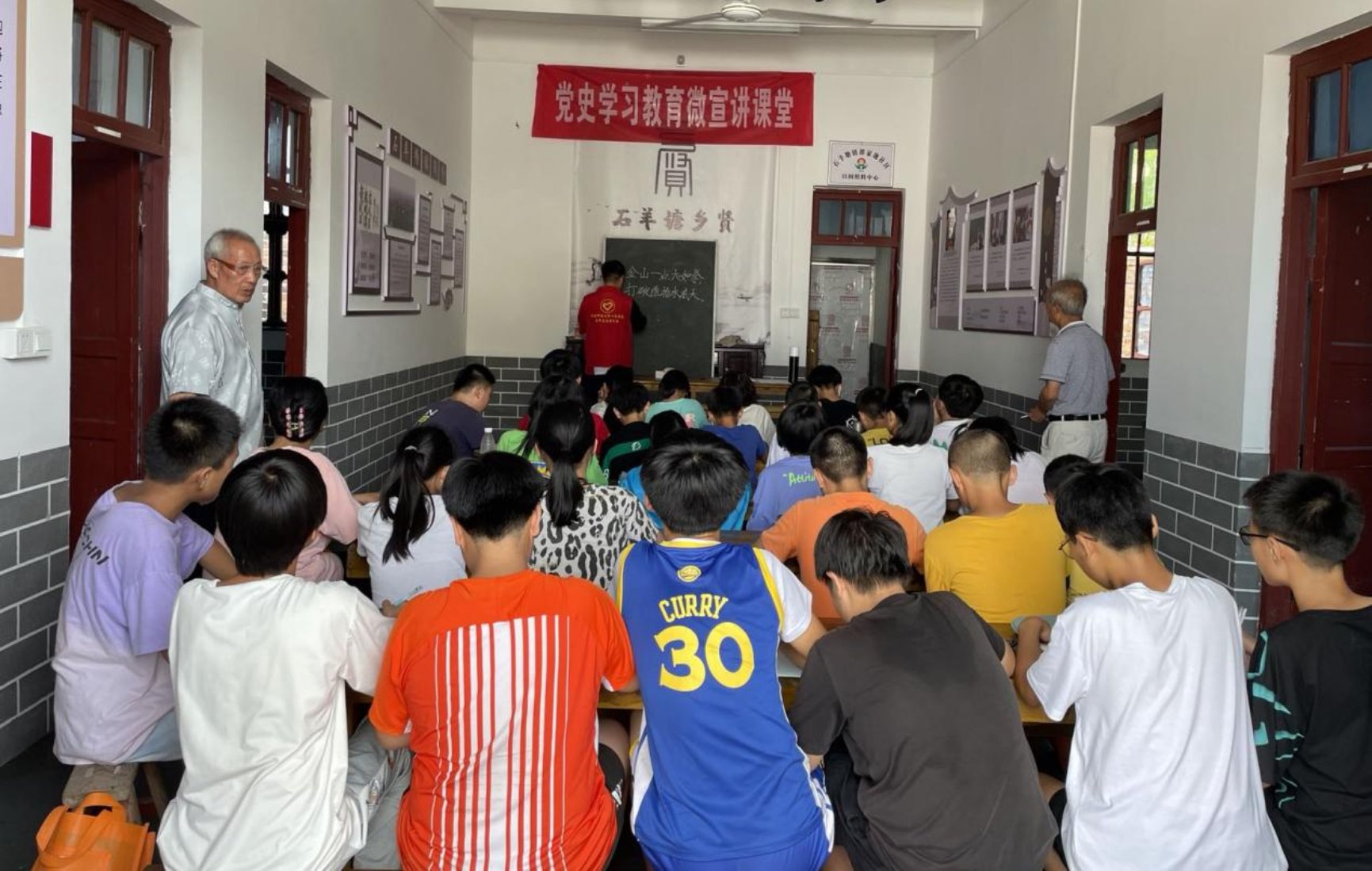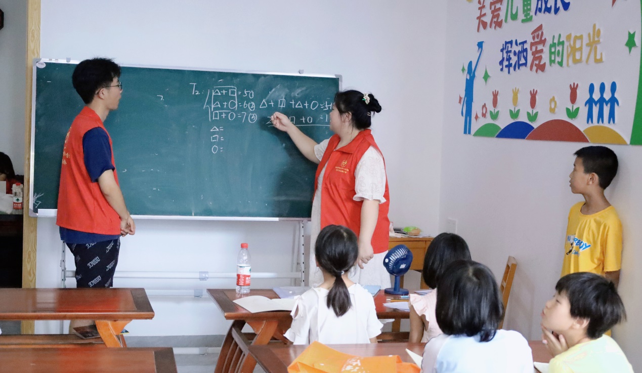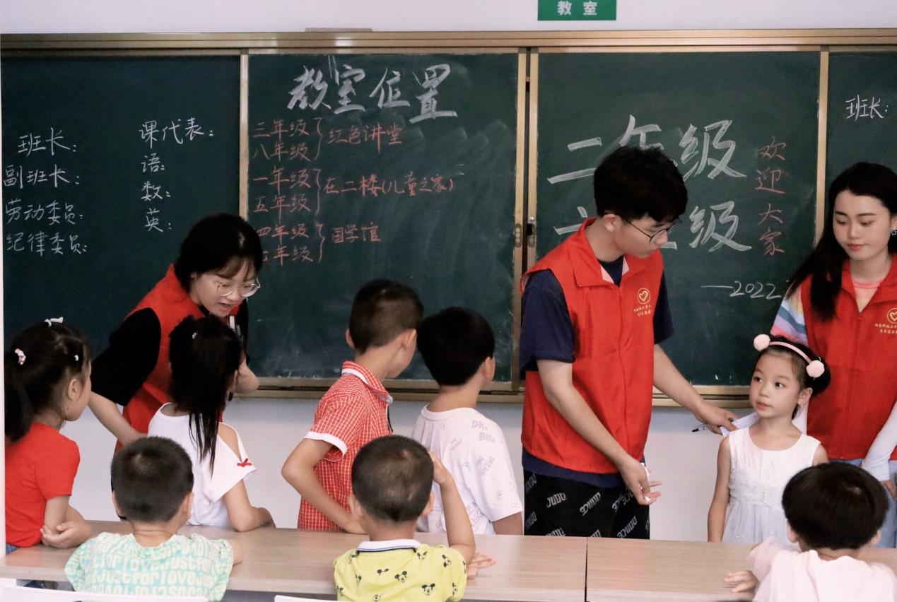 “嘟”一声响亮的哨声穿过各个教室,儿童之家暑期学校拉开了第一课的序幕。夏昭炎教授冒着炎炎烈日前往各个教室考察教学情况,他笑着对志愿者说道;“要把握好教学进度和时间安排,尽量做到把知识讲透、把道理讲通”。