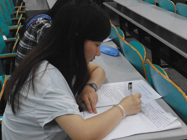 在204考场中,14级新闻专业学生埋头笔耕,教室弥漫着紧张的氛围。不时,有同学抬起头望着黑板上的写作要求冥思苦想。“大一刚入门,这种新闻写作大赛显得高大上,有些同学并没有写过新闻稿。所以它为我们敲响警钟,在接下来的时间要自觉投身实践,有意识地去学习如何写新闻,提高自身能力素养。”比赛结束后,14级新闻一班的高梦洁说道。