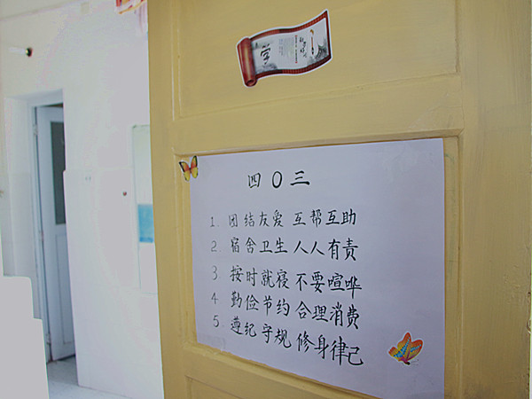 对联、照片、书法、植物……,五区四栋的20间寝室都各有风采,各有特色。还未进门,首先映入眼帘的便是极具个性的门号设计。“妙笔著文章,八仙过海各显神通。”八个姐妹喻成八仙,活泼风趣;漂亮大方的书法挂在宿舍墙上,配上几张八人合照和气球、垂下一串串彩色的千纸鹤,整个宿舍顿时就在文墨香和温馨中静谧安然。干净的地板,整齐的物品,书架上,书籍多而不杂,多而不乱,与墙上的墙纸相映,多了一份书生气。在各个宿舍,照片有贴着的、有挂着的,在桌子上、阳台上摆放着一盆盆小植物,简约大方的同时更具生活气息。在参观的过程中,罗振军老师连连夸奖并进行点评,同时也对宿舍之间和谐相处、文化气氛的塑造提出了希冀。