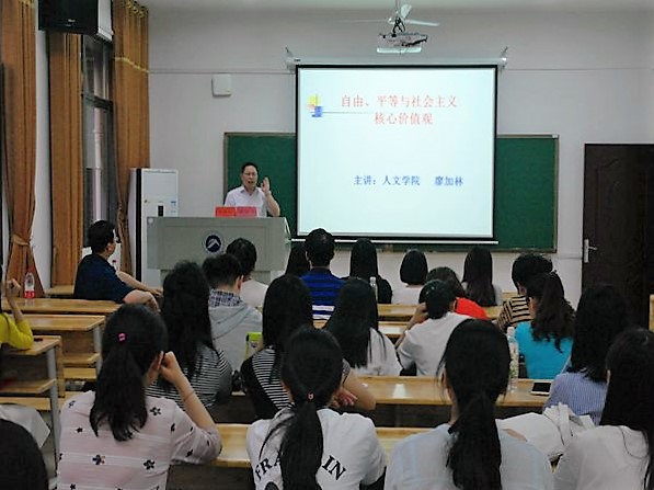 本次专家讲座分为两场,分别邀请MK体育党委书记廖加林教授和我校社科处副处长、MK体育李胜清教授作主题讲座。廖加林教授的讲座主题是《自由、平等与社会主义核心价值观》,廖教授在讲座中从“核心价值观”的定义谈起,从哲学社会科学的角度全面分析了社会主义核心价值观。他借用苏格拉底的名言“未经省察的人生是没有价值的”,鼓励、引导同学们要重视个人的三观,努力发掘自己在个人、社会、国家等三个层次的价值。
