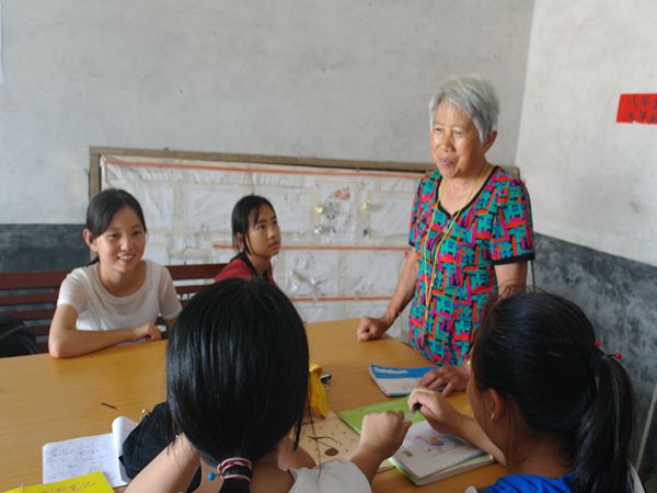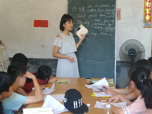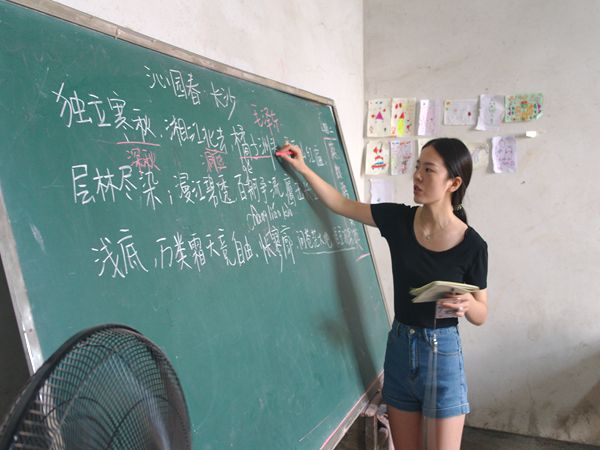 午后的太阳光十分强烈,带着浓郁的暑气。志愿者在教室细致地批改着孩子们的作业,清晰地标记错误部分,针对每个孩子不同的学习情况及存在的问题,他们在每个作业本上写下评语。见到手捧作业本前来询问难题的孩子,他们微笑地予以耐心解答,晶莹的汗珠从他们额间滑下,浸湿了衣衫。