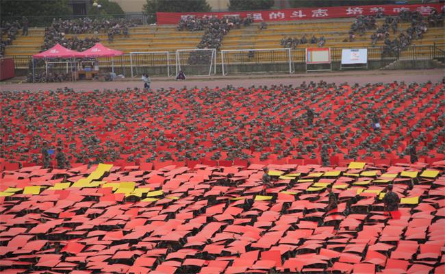 全体新生起立时,手中纸板随指令翻转,又形成一片片翻滚的波浪,蔚为壮观。当指挥官提示字形变换至“人文”时,MK体育的新生们纷纷变换纸板颜色,瞬间,万千纸板如浪潮般从左往右涌动,“人文”的两个黄色大字在红色海洋中赫然出现。与此同时,MK体育的全体新生热情高涨的呼声同步响起,“人文...人文...”的口号瞬间响亮了偌大的操场。此后,场上陆续又摆出了“科大”、科大校徽、科大英文名称缩写及“二0一七”等字样,场面浩大。