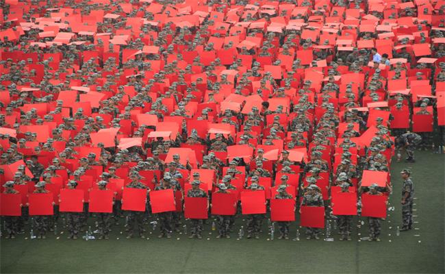 各个学院的“小绿人”们集合完毕后,穿绿色迷彩的全体新生们或顶或举着半米见方的一面红一或一面黄的纸板;主席台上,指挥教官手持话筒指挥新生们用纸板摆出各种字样及图形。全校新生共分为A,B,C三个区,每个学生都有各自的顺序,在教官的精心指挥下,A区新生相继摆出国旗,党旗与科大校旗。“B区C区做准备!”在各区按不同学院名称指示进行变换符号环节,指挥官一声令下,B区与C区的同学准确及时地抬起纸板,顷刻之间,红色的大背景上陆续出现“信息”、“物电”等各学院的简称。