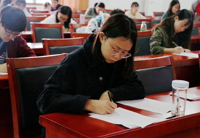“请写出含有‘秋’字的十句诗?请指出下列诗句所描写的季节?”下午13时30分,考试正式开始。此次比赛以笔试的方式进行,限时100分钟,考察试卷含默写、填空、连线等题型,所含内容丰富、知识覆盖面广泛,旨在考察学生的诗歌积累量和活用能力。“我只是抱着试一试的心态来参加这次比赛的,即便不能进入下一轮选拔赛,但能激励我在今后的学习中更加注重对中国优秀古诗词的记忆和探求!”17级汉语言文学专业的黄丹阳谈道。