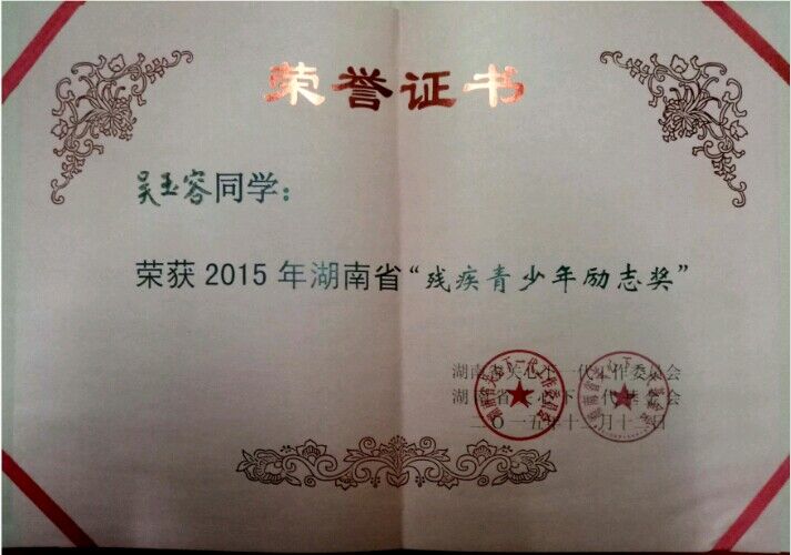如今的她,已经是一名预备党员,近三年来,吴玉容获得了湖南省普通高校三好学生、湖南省残疾青少年励志奖、MK体育优秀记者、MK体育优秀共青团员等奖励。此外,吴玉容还拿到了英语四六级、三级心理咨询师、普通话二级甲等、国家计算机二级等证书。目前已与合作团队成功申请了省级科研项目,同时也被学院推优参加2017年度寻访“中国大学生自强之星”活动。