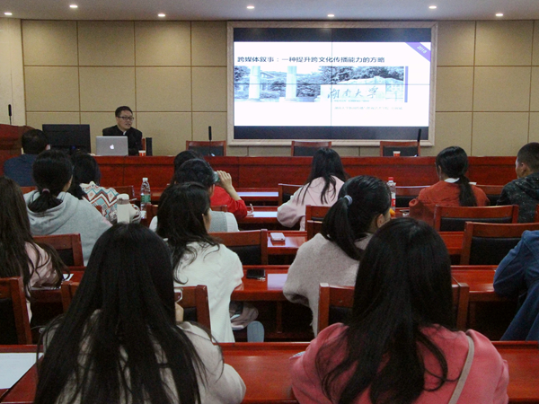 11月2日,湖南大学新闻传播与影视艺术学院院长彭祝斌教授应邀来院举办以“跨媒体叙事”为主题的学术讲座,陈功、黄洪珍、袁星洁、萧祥彪等老师及17、18级新闻学专业学生到场聆听。