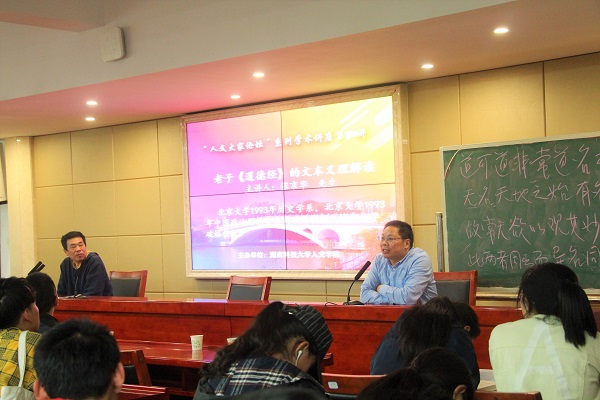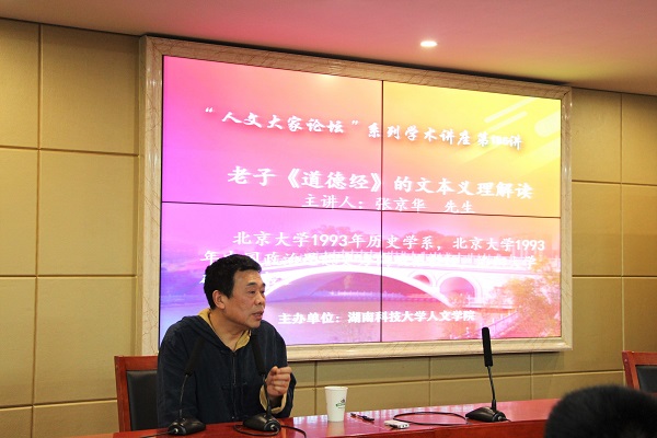 4月17日晚,湖南科技学院张京华教授应邀前来我校MK体育做了一堂题为“老子《道德经》的文本义理解读”的精彩学术报告。本次讲座由我院党委书记廖加林教授主持,我院吴广平教授、王友胜教授、张晚林教授、颜中军、胡忆红、余霞、胡红梅、龚超等老师及文、史、哲等专业的100多为本科生、硕士研究生到场聆听。